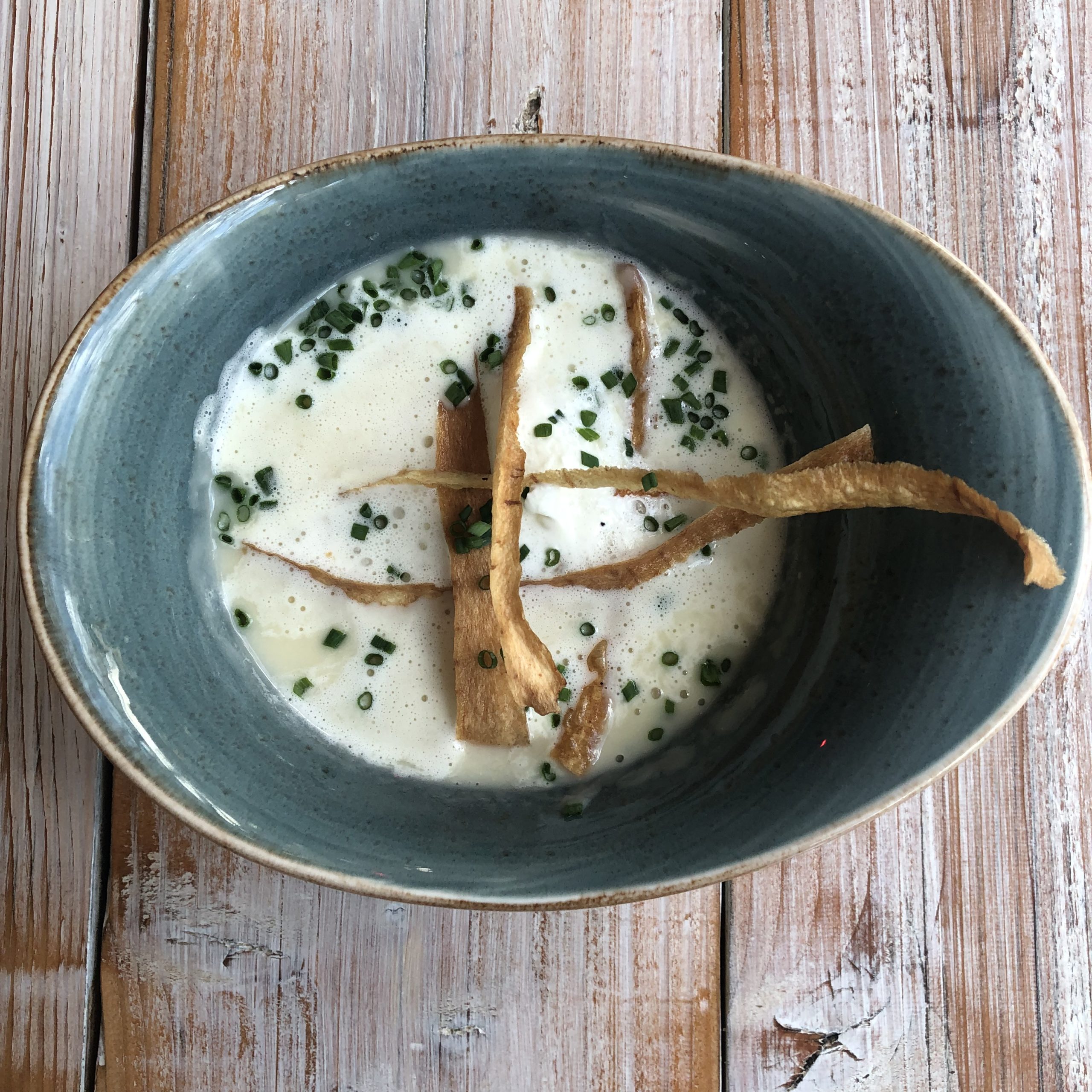 Cremige Pastinakensuppe mit eigenen Chips und Kräutern